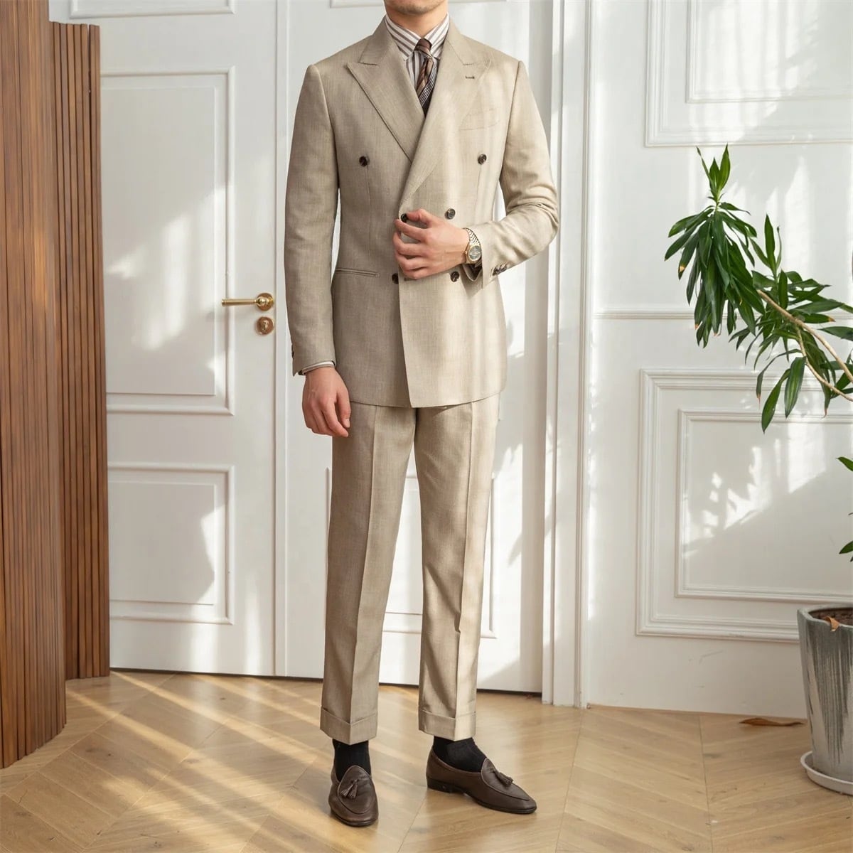 洗練されたスタイルと圧倒的な着心地を実現した【上質】ダブルセットアップ。上質なリネン素材を使用しており、落ち着いた色合いが特徴です。シンプルでありながら存在感のあるデザインは、フォーマルなシーンからカジュアルな日常使いまで幅広く活躍します。あなたのスタイルに洗練されたエッセンスをプラスしてくれるアイテムです。